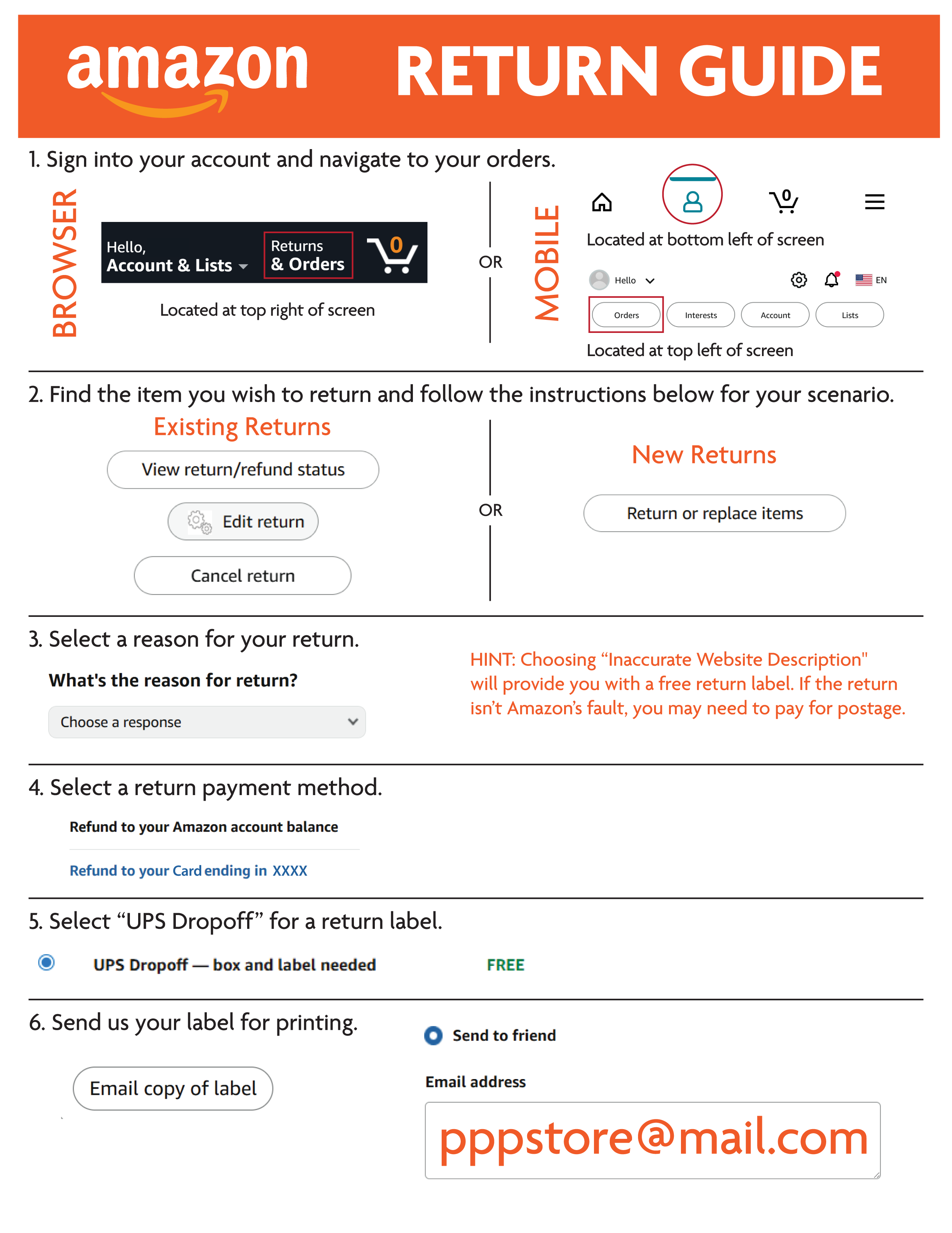 Please note: Amazon returns must use a prepaid UPS label, as QR codes cannot be accepted at this time. Follow this guide on how to get a UPS return label from Amazon.